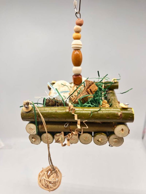 Bij dit pakket zit beukensnippers, kreukel papier, stukjes sepia, stuk trosgierst, een denneappel en een rotan balletje aan een vezeldraad super om te foerageren, lekker te rommelen en spelen!