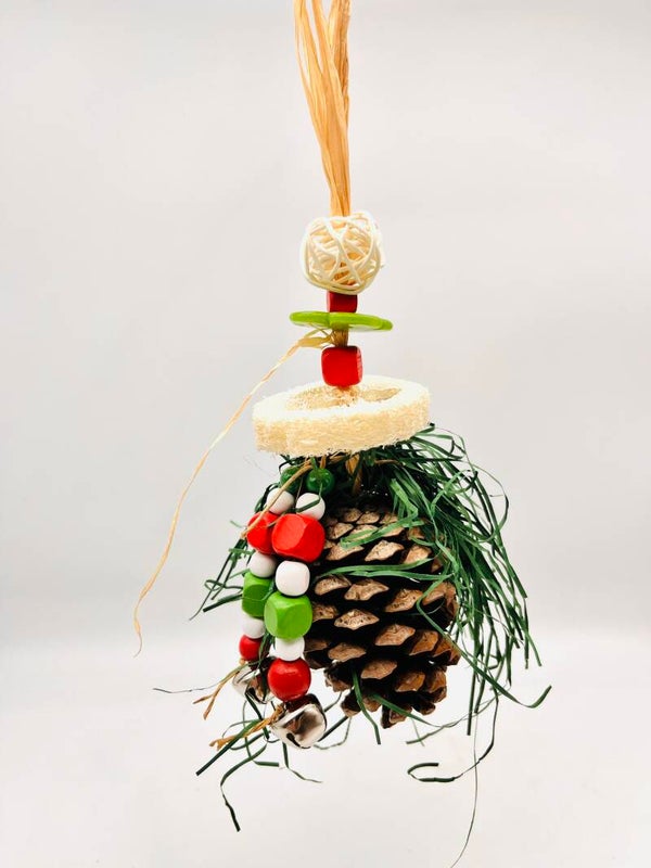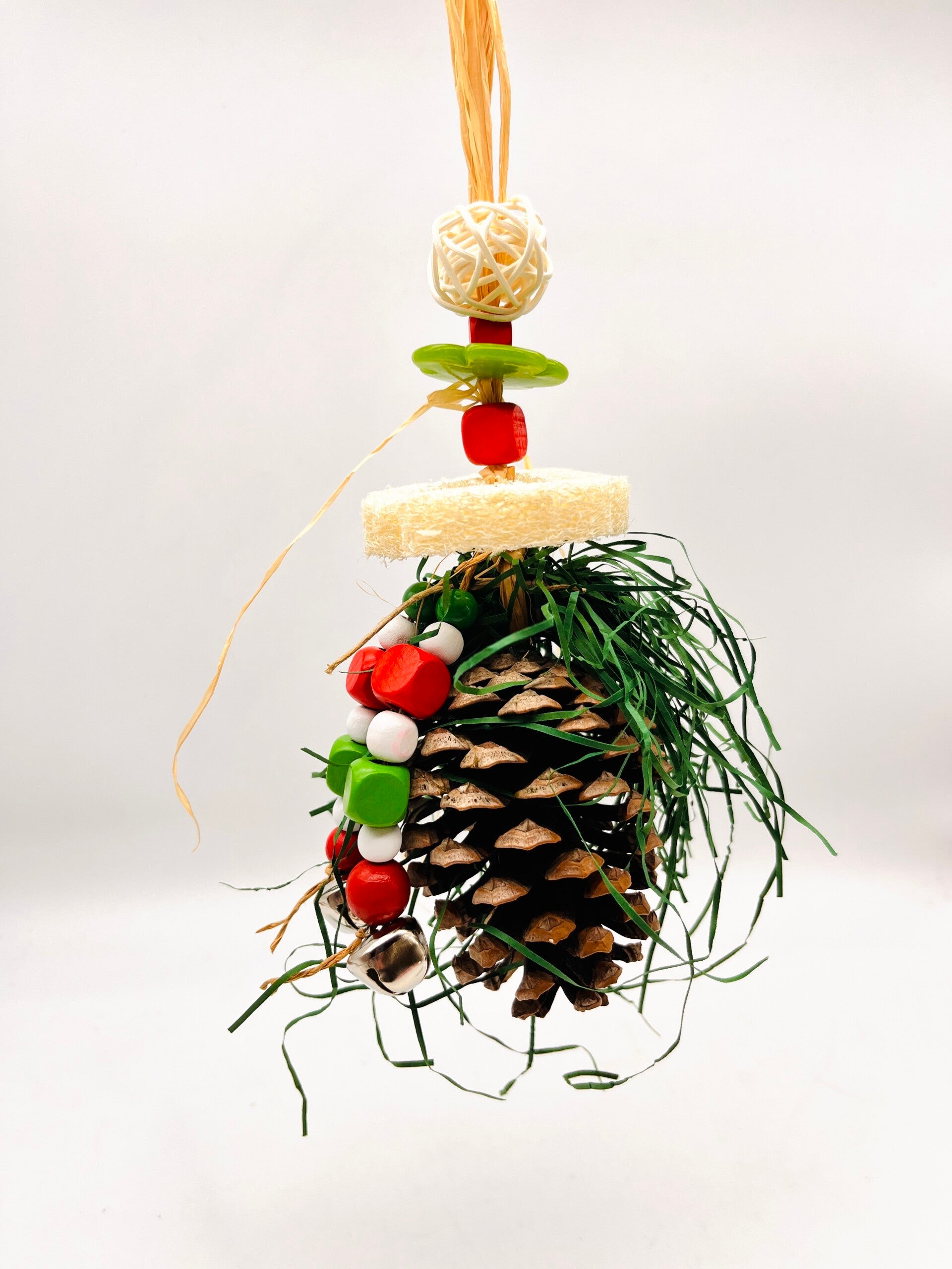 Een echte natuurlijke dennenappel in gezellige kerstsfeer. Super leuk om te spelen met de sliertjes , luffa en het rotan balletje.