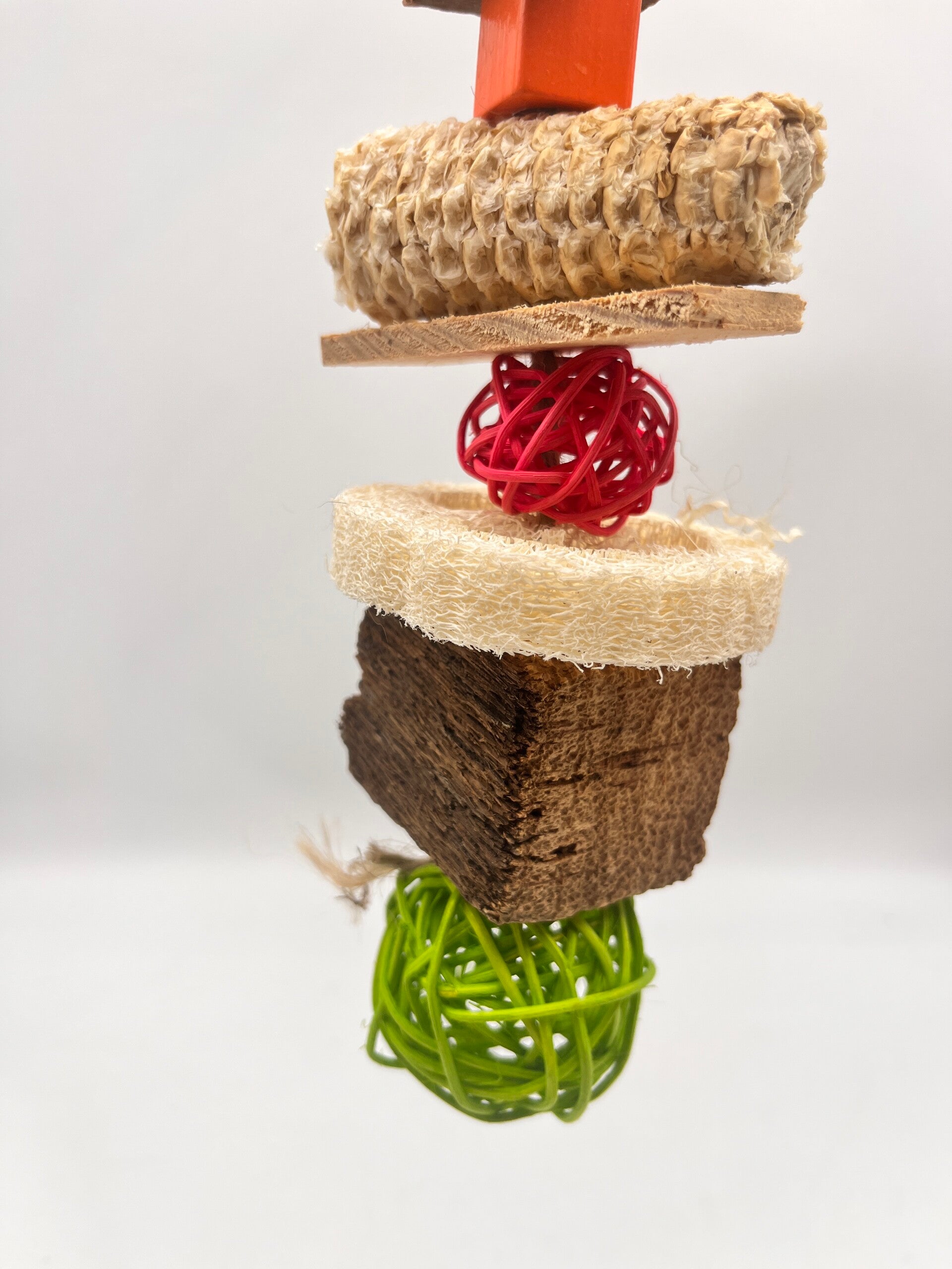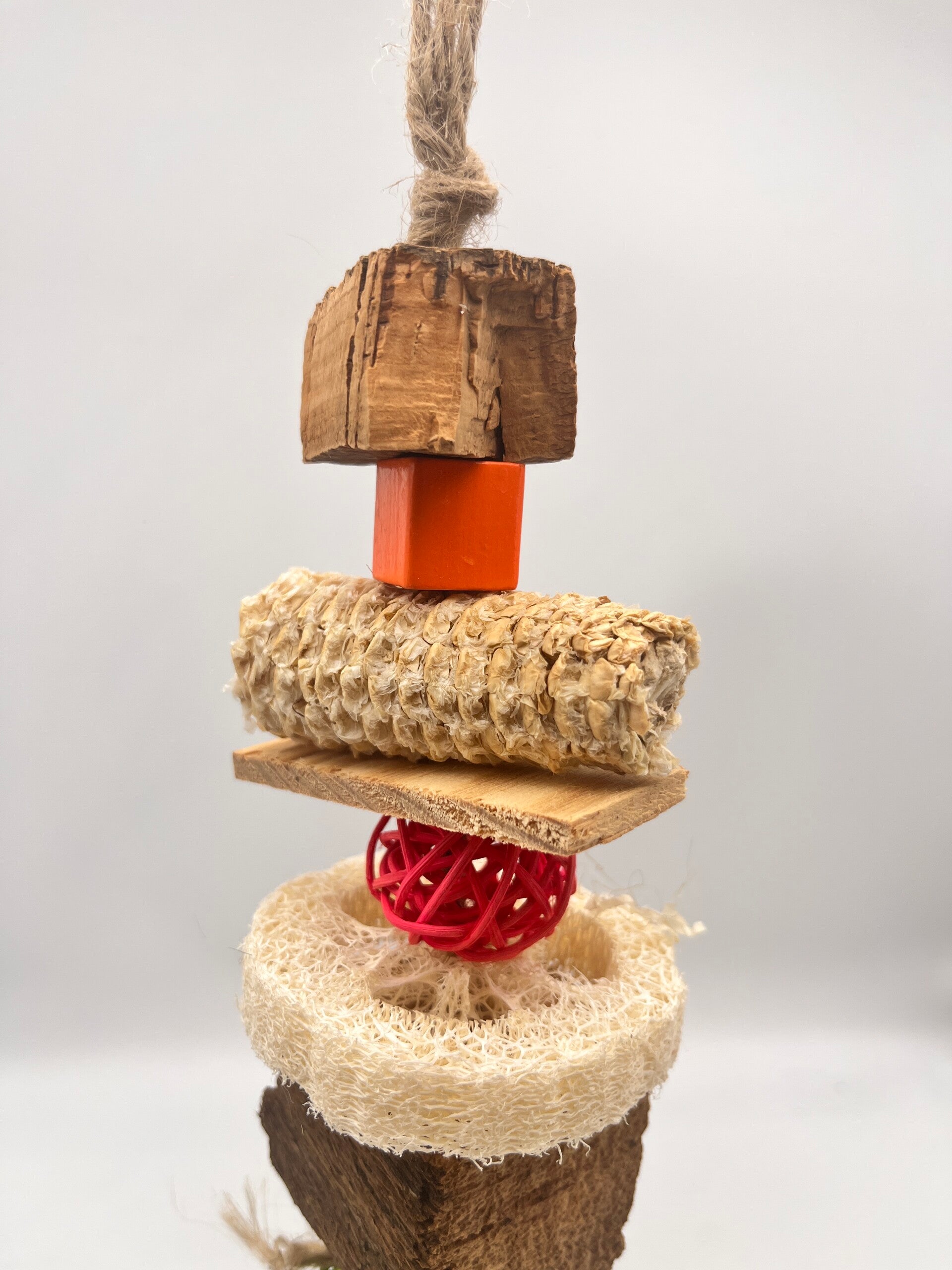 Een vogelspeeltje met kurk, rotan, mais en loofah allemaal verschillende structuren om goed te kunnen knabbelen.