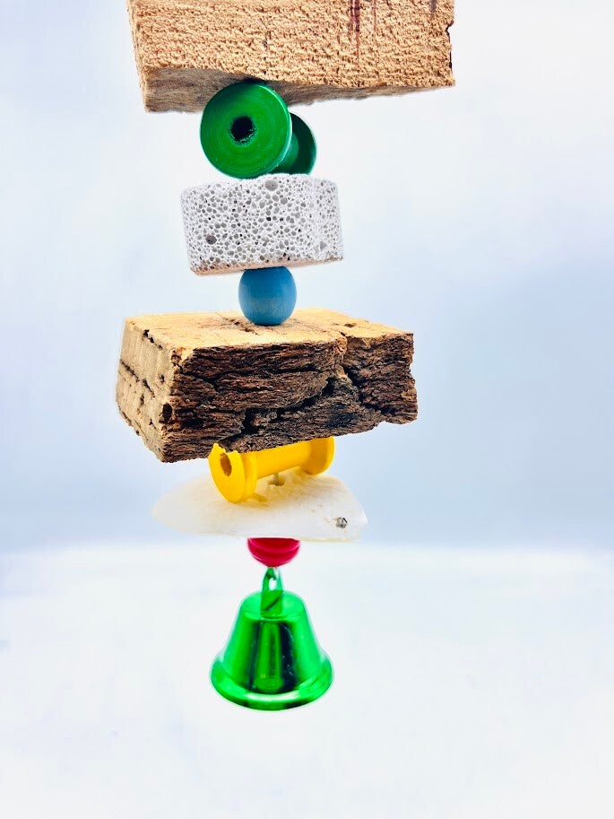 Dit speelgoed combineert hout, puimsteen en natuurlijke materialen zoals kurk en sepia waardoor jouw vogel veilig kan knagen, klimmen en spelen. Het helpt de snavel op een natuurlijke manier te slijten en voorkomt verveling in de kooi.