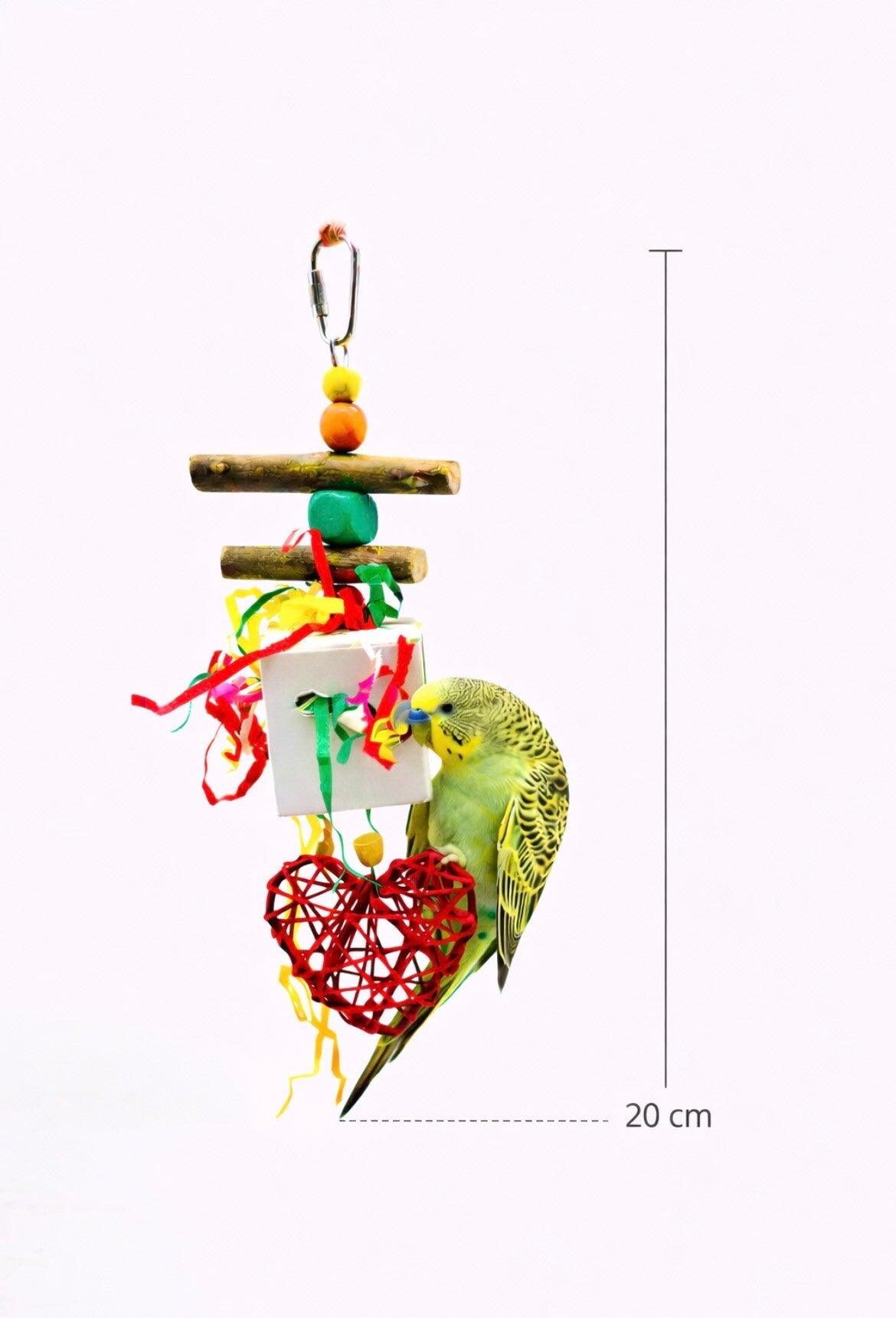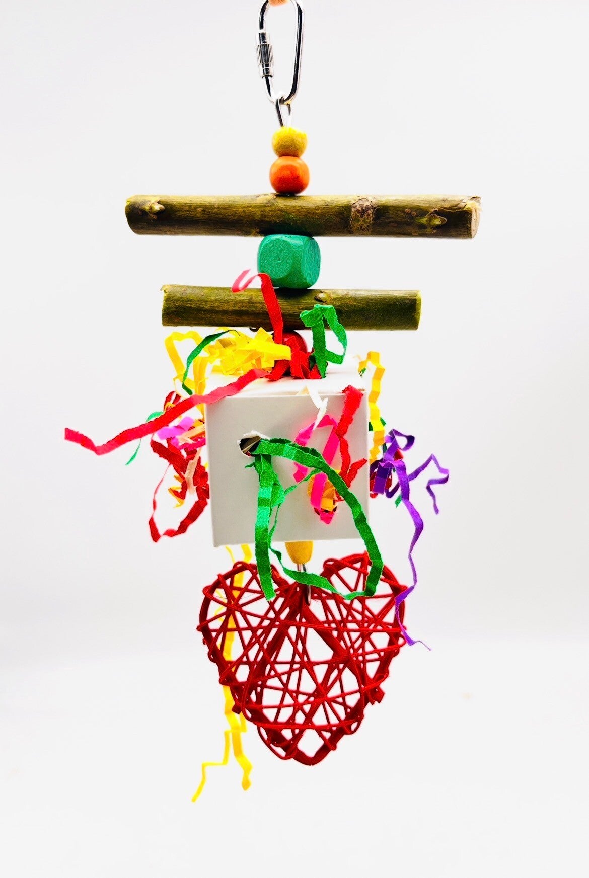 In het speeltje zit een doosje gevuld met kleurrijke sliertjes, ideaal om uit te peuteren en mee te trekken. De wilgenstokjes nodigen uit tot klimmen en knabbelen, en het rotan hart maakt het speeltje extra leuk én helemaal in Valentijnsstijl.