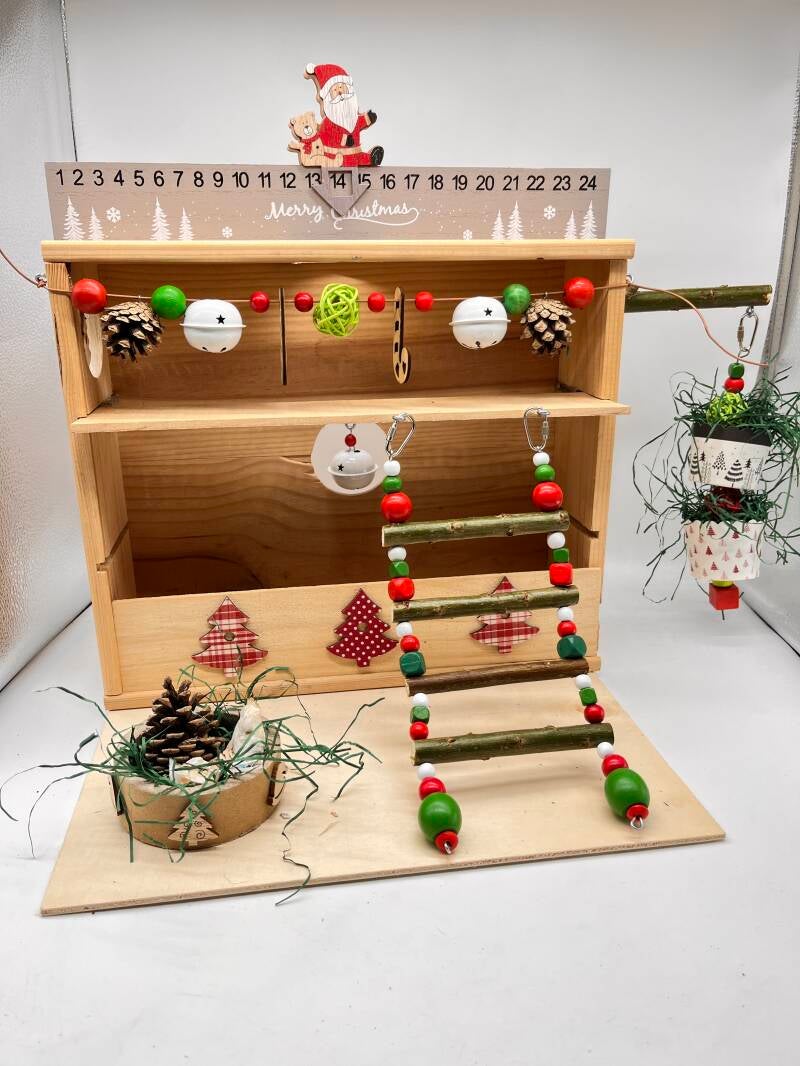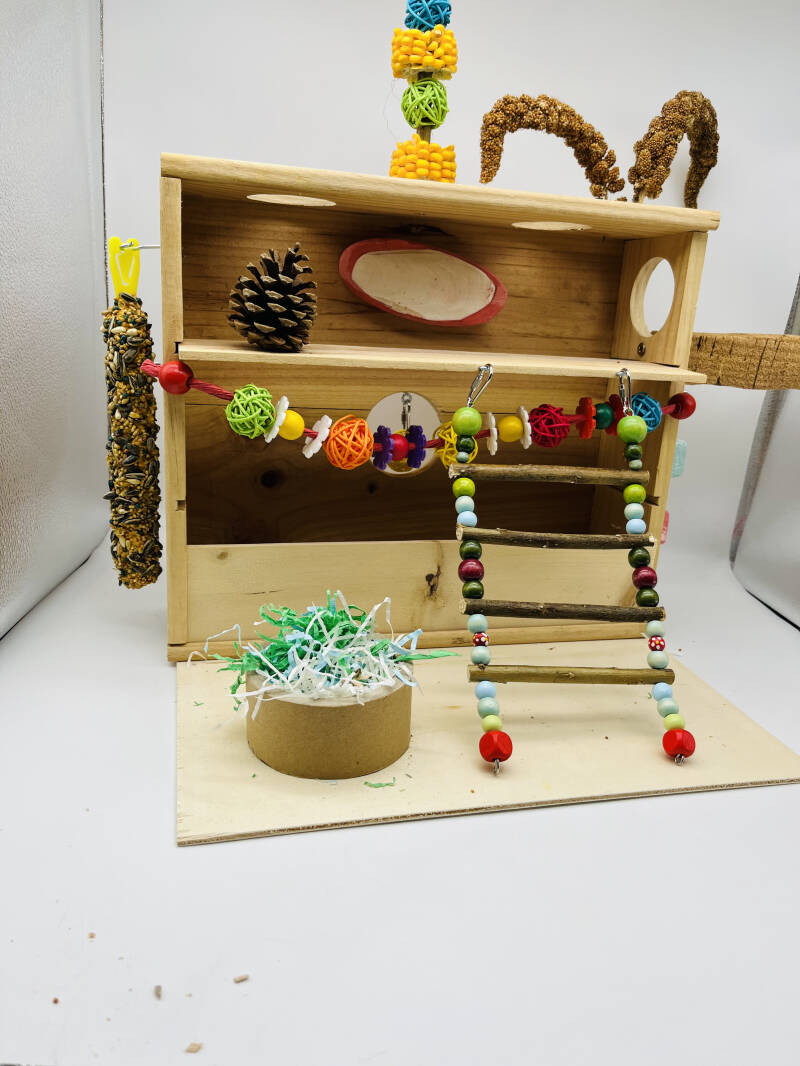 Een houten huisje vol met knibbel en knabbel speelgoed.